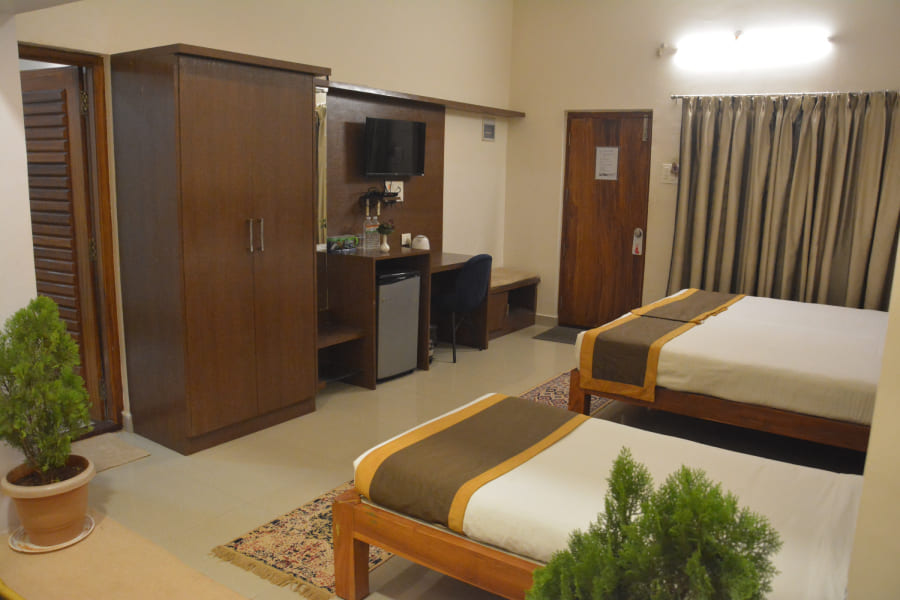 +91 9845202086The AC Deluxe Room is thoughtfully designed to provide a perfect blend of comfort and elegance, ensuring a relaxing stay for every guest. Equipped with modern air-conditioning, the room maintains a soothing atmosphere regardless of the season, allowing you to unwind after a day of travel or exploration. Spacious interiors, cozy furnishings, and tasteful décor create a welcoming ambiance, while amenities such as comfortable bedding, attached bathroom, and essential utilities make your stay both convenient and enjoyable.